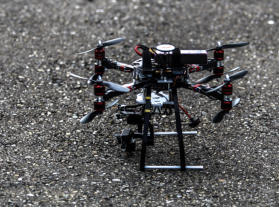 Der K 450 Octo aus eigener Herstellung wird von uns ebenfalls für den schnellenSchnappschuss oder für das kleine semi-professionelle Webvideo genutzt.Am 4 - Achs Gimbal findet eine GoPro Hero 4 “Black Edition” ihren Platz.Die Vorzüge einer GoPro Kamera können hier voll ausgenutz werden.Natürlich hat auch dieser Copter eine direkte Videoübertragung zum Boden,womit die Video- oder Fotoaufnahme ständig kontrolliert werden kann.Die demnächst überarbeitete Version bestitzt auch ein Einziehfahrwerk.Mit dem 2.4 GHz Datalink lässt sich der Copter mit der Groundstation füriPad oder PC neben der handelsüblichen Fernsteueranlage bedienen.Flugzeit: ca. 15 Minuten