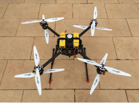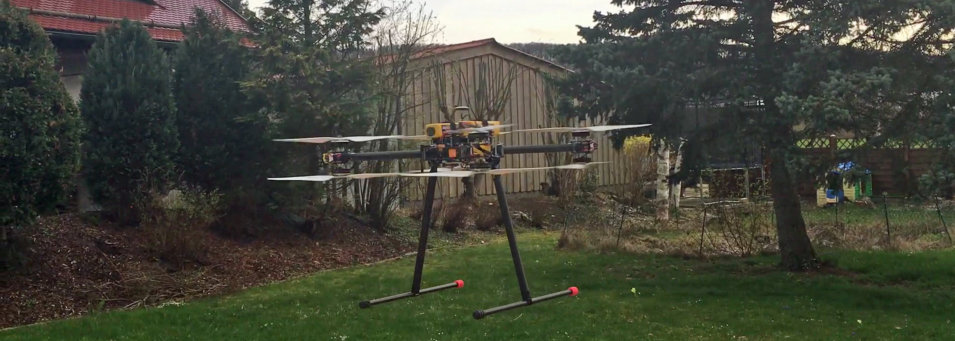Ein Multicopter für die etwas schwereren Lasten zu erschwinglichem Preis. Die Verbindungselemente sind aus CNC-gefrästem Luftfahrt Alluminium.Die Landekufen können 90° nach oben gefahren werden und ermöglichen dadurch eine ungestörte 360° Rundumsicht.Ein Schnellwechselverschluss ermöglicht es, die unterschiedlichsten Nutzlastenin kürzester Zeit am Copter zu befestigen, z.B. Kamera-Gimbal oder eine Abwurfbox.Dieser Copter ist für den professionellen Einsatz konzipiert und benötigt Pilot und Kameramann als Bedienpersonal.Stabilisierung:DJI A3, A2 oder Naza V2 mit GPSSteuerung:Über Handsender oder DJI Datalink mit GroundstationVideoübertragung:DJI LightbridgeFlugdatenaufzeichnung: DJI OSD Mark IIAntrieb:8 x Foxtech Motor X5010 / 288 rpm/VRegler:8 x S35a SimonK ESCPropeller:8 x Multistar 18” x 6,1” oder 16 x 5,4”Stromversorgung:1 - 2 x 6s 16.000 mAh Lipo Akkus oder1 - 2 x 6s 5.800 mAh Lipo Akkus oderHöhe:600 mmBreite / Durchmesser:850 mmMax. Startgewicht:8,5 kgNutzlast:max 4,1 kg je nach AkkukonfigurationFlugzeit:15 - 20 Minuten je nach KonfigurationDie Zuladung, Anbauteile und Aufhängung kann individuell angepasst werden.Preis auf Anfrage!